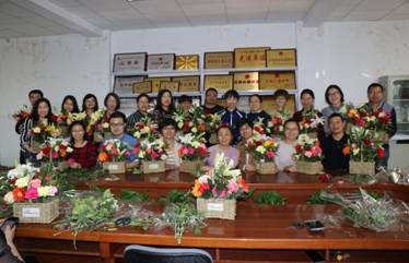 物理与电子电气工程公司分工会于2018年3月14日下午在博远楼209、210会议室举行插花艺术礼仪讲座和培训活动。活动由公司党委书记王志霄、公司分工会主席李春树分别主持,银川天地缘花店花艺总监戚建筠主讲,公司女教工和部分男教工参加。