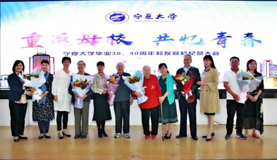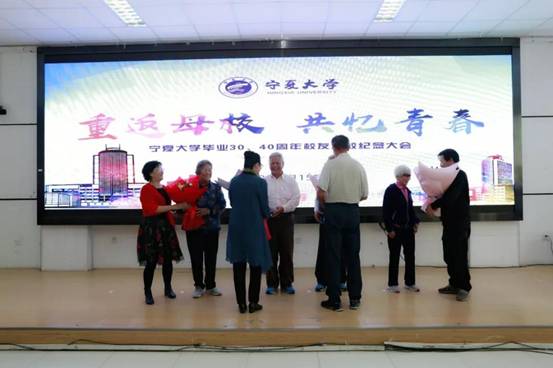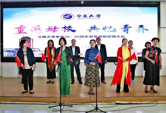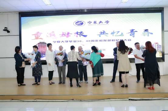 会议最后,返校班级代表为恩师献花。原银川师专86级音乐系员工带领与会师生合唱《我和我的祖国》、《年轻的朋友来相会》,共同祝福祖国更加繁荣昌盛。纪念大会在大家的合唱声中落下帷幕。