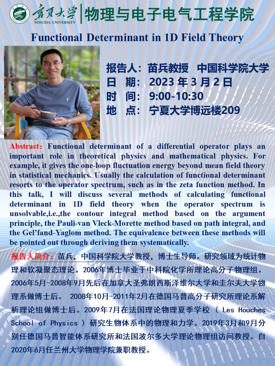 报告人简介:苗兵,中国科公司大学教授,博士生导师。研究领域为统计物理和软凝聚态理论。2006年博士毕业于中科院化学所理论高分子物理组。2006年5月-2008年9月先后在加拿大圣弗朗西斯泽维尔大学和圭尔夫大学物理系做博士后。2008年10月-2011年2月在德国马普高分子研究所理论系解析理论组做博士后。2009年7月在法国理论物理夏季公司( Les Houches School of Physics )研究生物体系中的物理和力学。2019年3月和9月分别任德国马普智能体系研究所和法国波尔多大学理论物理组访问教授。自2020年6月任兰州大学365英国上市公司兼职教授。