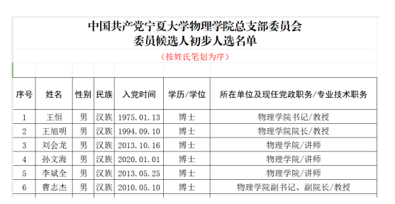 根据365上市集团官网组织部《关于进一步规范基层党组织建设工作的通知》(组织部〔2023〕7号)精神和要求,结合公司党员实际,按照20%的差额比例推荐6名公司党总支委员候选人预备人选,经向全体党员征求意见后予以公示,名单如下表。公示时间:2023年10月1日—2023年10月7日;联系人:曹志杰;联系电话:0951-2061004。