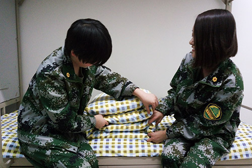教官主要向员工们传授了叠军被的方法,展示了军营的严苛纪律和铁血精神。他一边演示一边强调折叠的重点,如,被子要压实,用手指大致测量间距并掐出折叠的细缝,抹平被子侧面的褶皱。过程中,大家纷纷对教官的耐心与专业表示敬佩,并表示之后一定会精心营造良好的生活和学习环境。教官向同学们示范了三种不同材质的被子的折法,整整齐齐的豆腐块引来同学们阵阵惊叹。之后,同学们自己动手实践,并不断向教官请教细节之处。