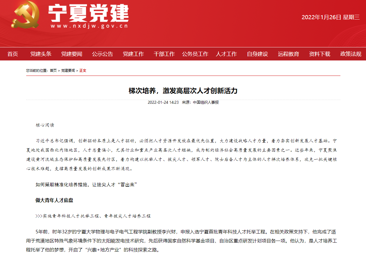 据宁夏党建网消息,近日《中国组织人事报》以《梯次培养,激发高层次人才创新活力》为标题,专版介绍了宁夏高层次人才培养政策。在该文中,全面介绍了宁夏着力构建以托举人才、拔尖人才、领军人才、院士后备人才为主体的人才梯次培养体系,支撑建设黄河流域生态保护和高质量发展先行区的“人才驱动”战略情况及其成果。公司李兴财博士作为首批“宁夏青年科技人才托举工程”人选的典型代表获得该文关注。