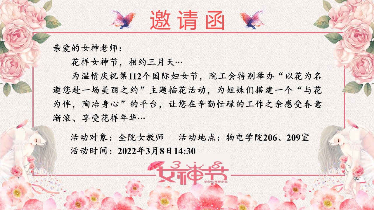 此次插花活动搭建了一个“与花为伴,陶冶身心”的平台,不仅丰富了公司女教工的业余生活,也提升了女教工的审美品味。在活动中,每一位女教工展示了独特的插花技能和自我魅力,气氛热烈、其乐融融……公司分工会精心设计制作了美丽的邀请函及祝福卡,表达公司对女教工崇高的敬意和诚挚的问候!
