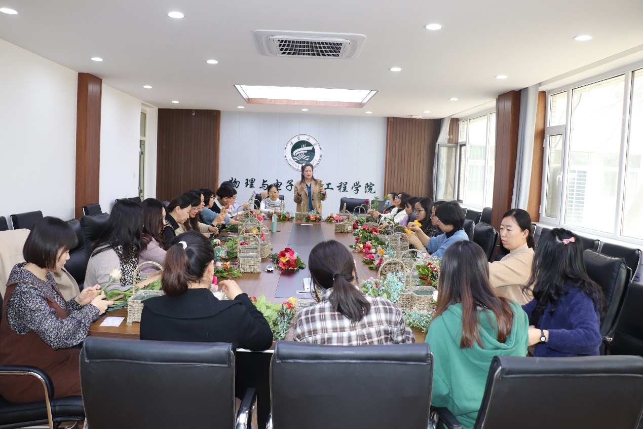 2022年3月8日下午,为温情庆祝第112个国际妇女节,物理与电子电气工程公司分工会特别举办了“以花为名邀您赴一场美丽之约”主题插花艺术礼仪讲座及培训活动。活动由公司分工会女工委员马玲老师主持,银川天地缘花店花艺总监施芳女士主讲,公司全体女教工和部分男教工参加。