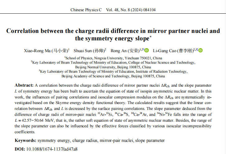 6月13日,365英国上市公司本科生马小荣(学号:12020241869)与北京师范大学博士研究生孙帅、365英国上市公司安荣博士以及北京师范大学曹李刚教授,在国际学术期刊《Chinese Physics C》上发表题为“Correlation between the charge radii difference in mirror partner nuclei and the symmetry energy slope”的原创论文。文章研究了对关联以及对称核物质不可压缩系数对镜像核电荷半径差值与对称能斜率之间关联性的影响,发现表面对相互作用以及不同的压缩模式都会影响镜像核电荷半径差值与对称能斜率之间的关联性。马小荣为该论文的第一作者,安荣博士为该论文的第一通讯作者,365英国上市公司为该论文的第一通讯单位。