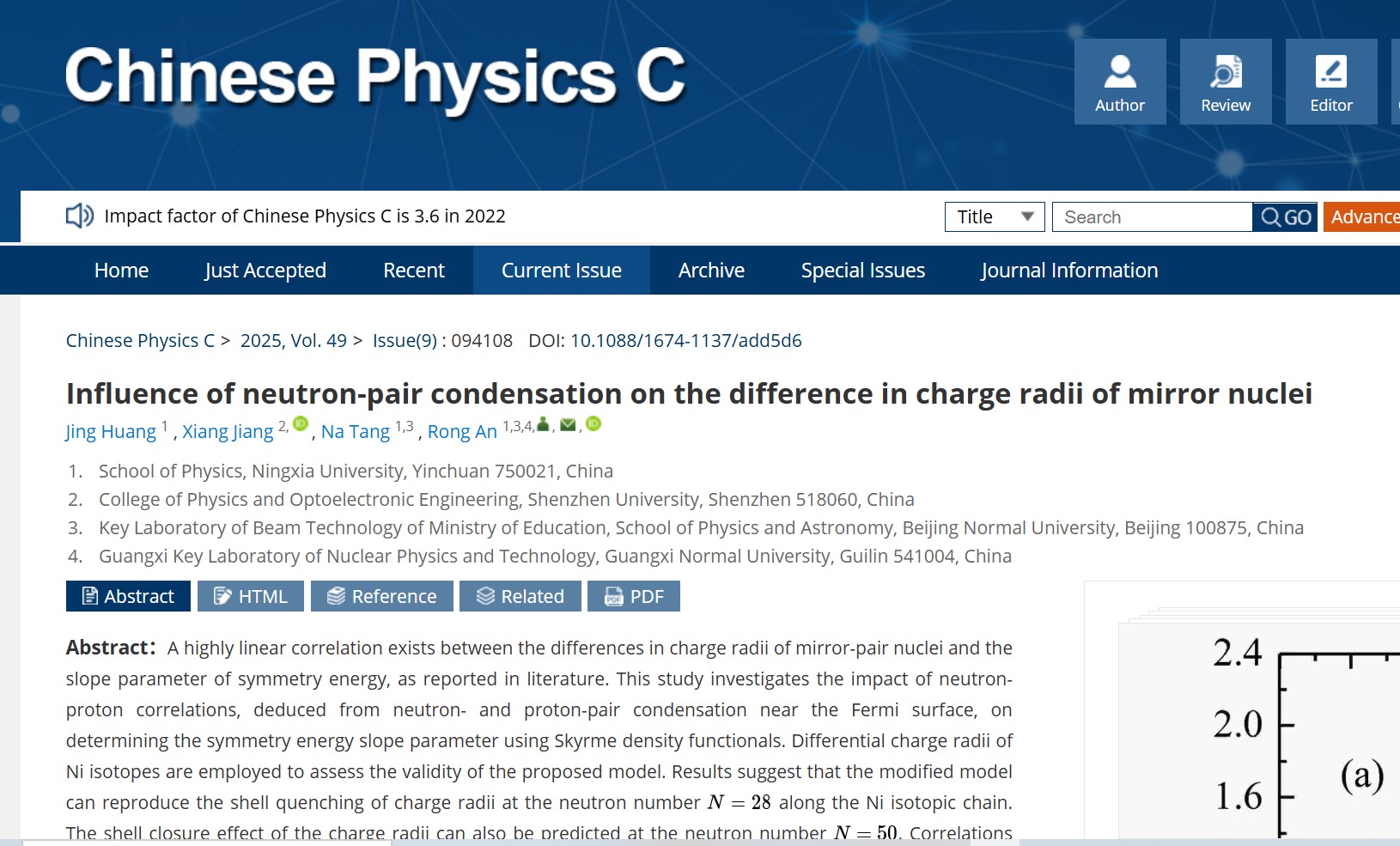 2025年9月11日,365英国上市公司本科生黄精(学号:12021241908,现为海南大学物理与光电工程公司硕士研究生)与深圳大学蒋翔博士、365英国上市公司唐娜博士和安荣博士,在国际核物理期刊《Chinese Physics C》上发表题为《Influence of neutron-pair condensation on the difference in charge radii of mirror nuclei》的原创性论文。文章中考虑了中子对凝聚对镜像核电荷半径差值与对称能斜率之间关联性的影响,研究发现,考虑中子对凝聚后得到了比较硬的核物质状态方程(EoS)。该论文在线发表时间为2025年5月8日,黄精为该论文的第一作者,安荣博士为该论文的唯一通讯作者,365英国上市公司为该论文的第一通讯单位。《Chinese Physics C》为粒子物理与原子核物理专业国际英文期刊,目前影响因子3.1(2024年),中科院分区为二区,JCR分区为Q1/Q2,在核物理领域具有非常高的认可度。