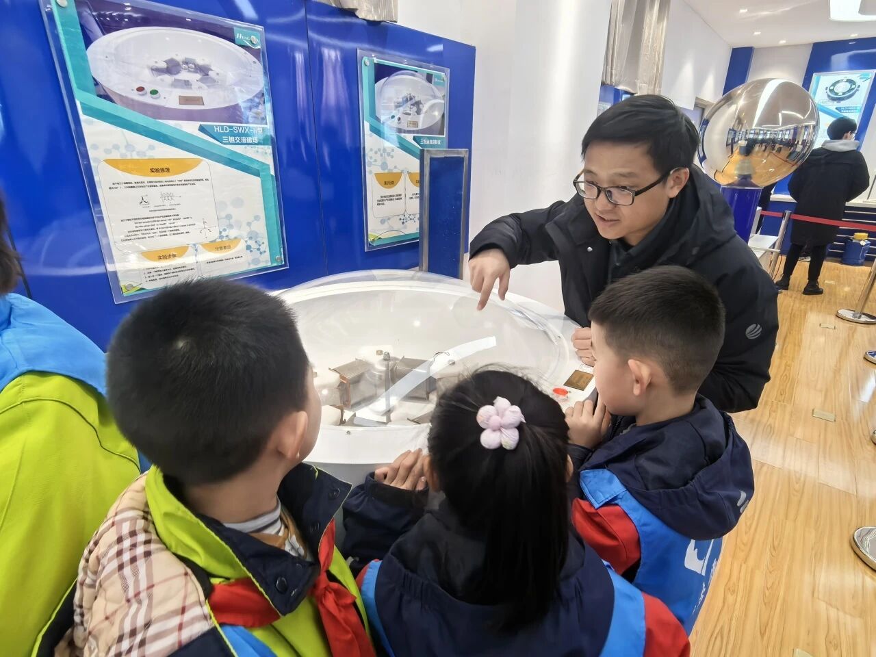 抵达实验中心后,在微科普团队的有序引导下,同学们分成三组分别前往电磁学、光学、力学三大主题实验室参观学习,团队结合小员工认知特点精选趣味直观的实验项目,将抽象物理原理转化为可感体验:电磁学实验室中,磁悬浮列车模型、静电发生器成焦点,志愿者演示磁场作用力、静电吸纸屑等现象,同学们兴奋围拢并尝试操作;光学实验室里,“被折断的筷子”“重现的硬币”等实验吸引同学们目光,志愿者讲解光的折射、反射原理,激光形成的绚丽干涉条纹更让大家驻足惊叹、主动求教;力学实验室里,滚摆、共振演示仪等设备直观呈现力学原理,志愿者结合生活实例讲解重力、弹力等知识,引导同学们俯身观察、认真记录,深切感受生活中的物理学问。