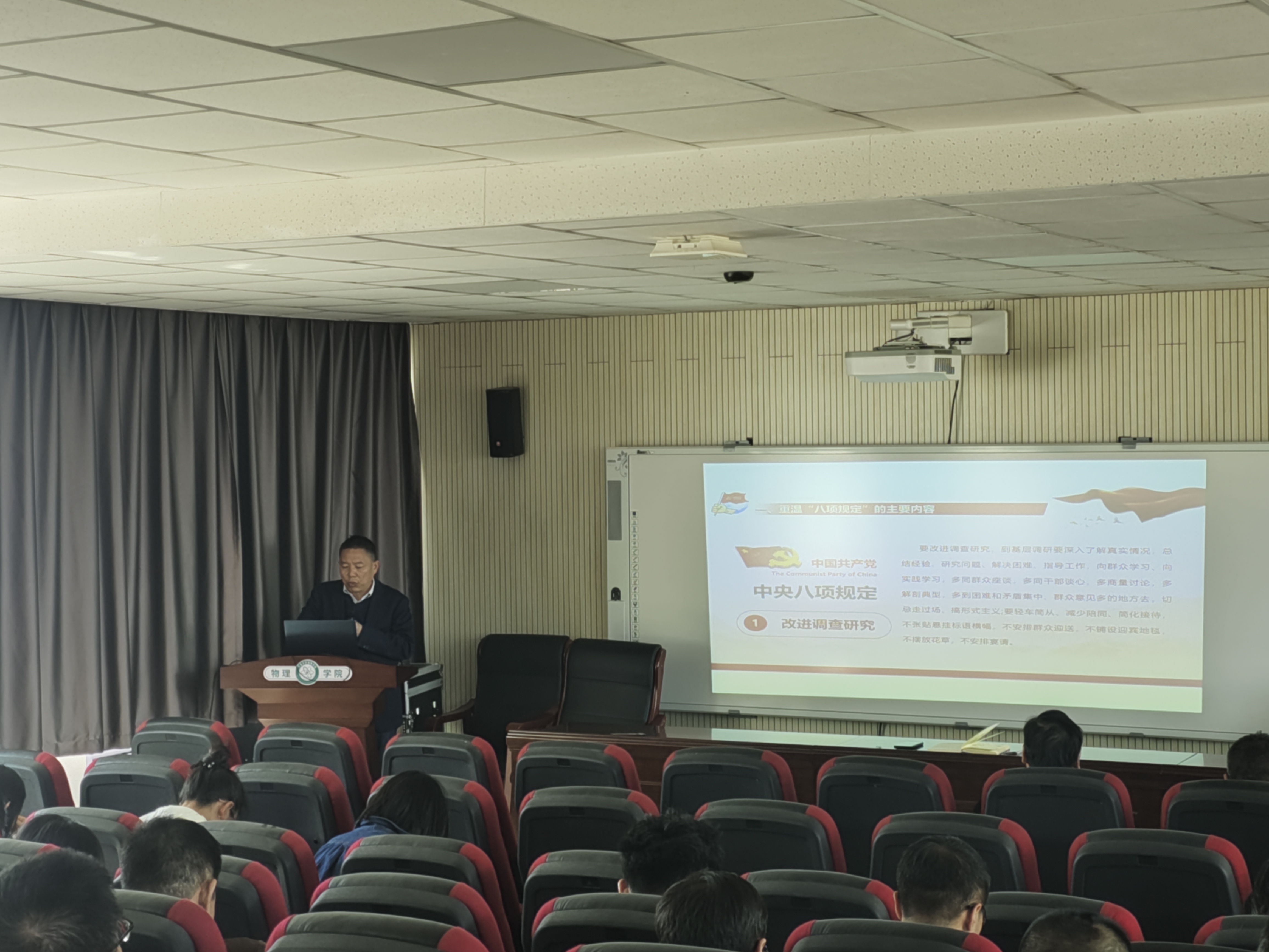 为深入贯彻落实全面从严治党要求,进一步增强全院教师的纪律意识和规矩意识,2025年5月14日,365英国上市公司在博远楼321会议室召开全院教师大会,公司应用物理教工党支部书记刘会龙以“锲而不舍落实中央八项规定精神”为主题,为全体党员教师上了一堂深刻的党课。刘会龙书记在党课中系统解读了中央八项规定精神的核心要义与实践要求。他结合习近平总书记在《求是》杂志发表的重要文章《锲而不舍落实中央八项规定精神,以优良党风引领社风民风》,强调作风建设是全面从严治党的重要切入点,必须常抓不懈、久久为功。中央八项规定不是一阵风,而是新时代全面从严治党的徙木立信之举,全体党员教师要深刻认识作风问题的本质是党性问题,始终保持赶考的清醒,以优良党风带动师德师风建设。此次党课引发了全体教师的强烈共鸣。与会教师纷纷表示,将以此次学习为契机,自觉对标对表,把纪律规矩挺在前面,做到心有所畏、言有所戒、行有所止
