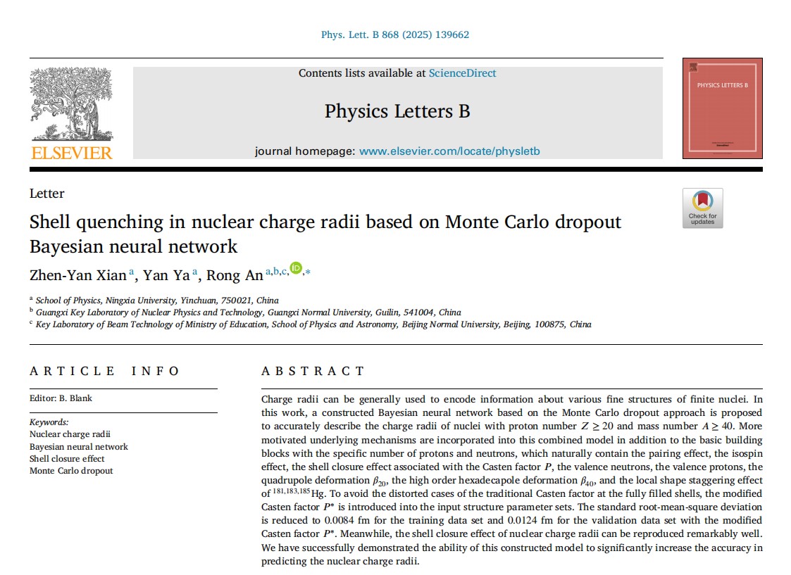 2025年6月17日,国际著名核物理期刊《Physics Letters B》在线发表了题为《Shell quenching in nuclear charge radii based on Monte Carlo dropout Bayesian neural network》的论文。该论文的第一作者为365英国上市公司本科生冼振谚(学号:12023243826),第二作者为365英国上市公司硕士研究生雅燕,365英国上市公司安荣博士为唯一通讯作者,365英国上市公司为该论文的第一通讯单位。该杂志出版国家为荷兰,出版商为Elsevier,JCR分区为Q1,中科院大类分区为2区,小类核物理分区为1区,文章以Letter形式发表。2024年诺贝尔物理学奖授予美国科学家约翰·霍普菲尔德(John J. Hopfield)和英裔加拿大科学家杰弗里·辛顿(Geoffrey E. Hinton),以表彰他们通过人工神经网络实现机器学习而作出的基础性发现和发明。人工智能机器学习方法在核物理学科中得到了广泛的应用,例如预测原子核的质量、原子核的衰变性质以及低激发态性质,原子核反应中的产物截面以及原子核的尺寸大小等。该文章基于Monte Carlo dropout贝叶斯神经网络方法,在输入层结构中考虑了价核子,Casten因子以及形变的影响,系统地研究了电荷半径的演化趋势。研究发现,通过改进的Casten因子可以很好地再现电荷半径的壳效应,并进一步提高了模型的外推能力。该研究结果对于理论模型的发展以及实验探测都具有重要的参考价值。该论文是公司首篇发表在《Physics Letters B》上的学术成果,是公司“双一流”建设的一项重要...