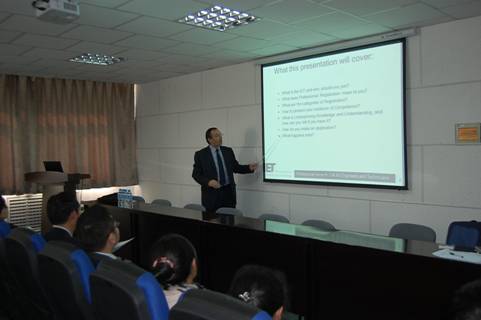 2012年10月21日下午,英国工程技术学会皇家注册工程师、资深会士,现任IET职业发展部门经理Dick Bacon先生在物理电气信息公司学术报告厅217室,为公司相关 专业的研究生和部分老师做学术报告,报告会由车进副经理...
